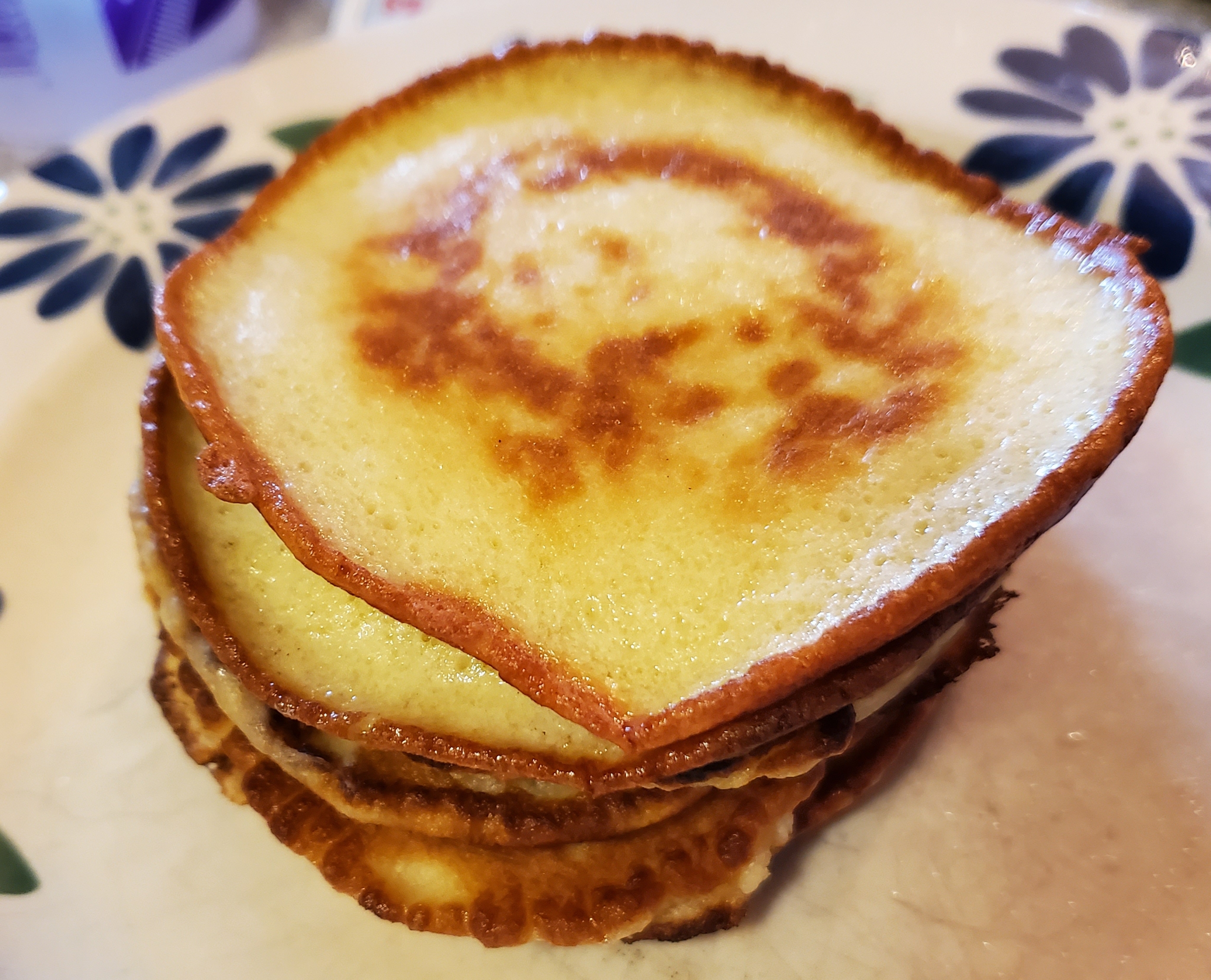 Canape Pancakes unlike regular pancakes has no baking powder. They have a very close consistency, so they don’t absorb the syrup and get soggy and fall apart. You can cook these in a non-stick griddle, but I prefer to oil the pan with Crisco shortening, so the edges get a little crisp.