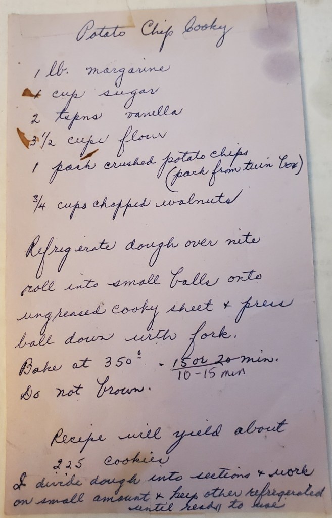 Since I was a little girl, my grandmother would always bring over cookies and pies at least twice a month when she wasn’t jet-setting around the world. While she couldn’t cook very well, she was a good baker. Czech Kolacky and Rohlicky, Plum Dumplings, Pumpkin pies and Bohemian Rye Bread were a staple in our house, until one day she brought over this curious cookie that her sister Betty made – the Potato Chip Cookie.