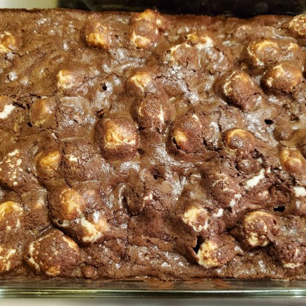 As I was pulling out the remaining ingredients for the brownies, I realized I could spice them up a bit and added cinnamon and cayenne pepper to make them a Mexican Chocolate Brownie. Add in the pecans (or walnuts) and marshmallows and what do you have…Rocky Road.