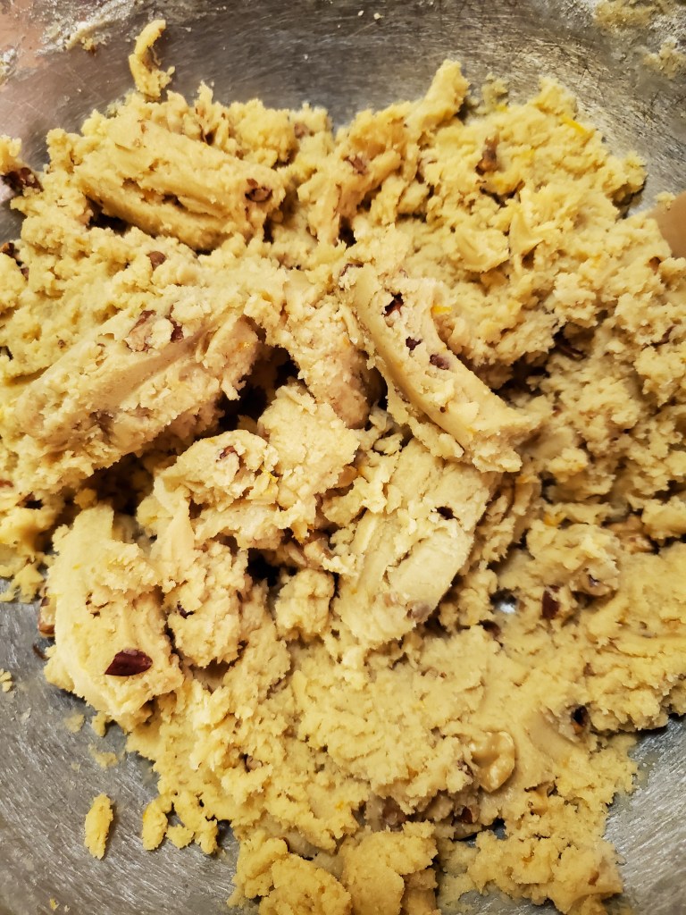 One of the first things you want to do when prepping your ingredients is to toast your nuts. You can do this either on the stove top or in the oven, and it only takes about 5 to 10 minutes, until you smell the nuts making sure they are lightly toasted. You can use either butter or shortening for this recipe or a combination of the two. I used shortening, simply because I had more of that on hand. Once you cream together the sugars and shortening, add the juice, zest and egg, along with a tablespoon of Cointreau.