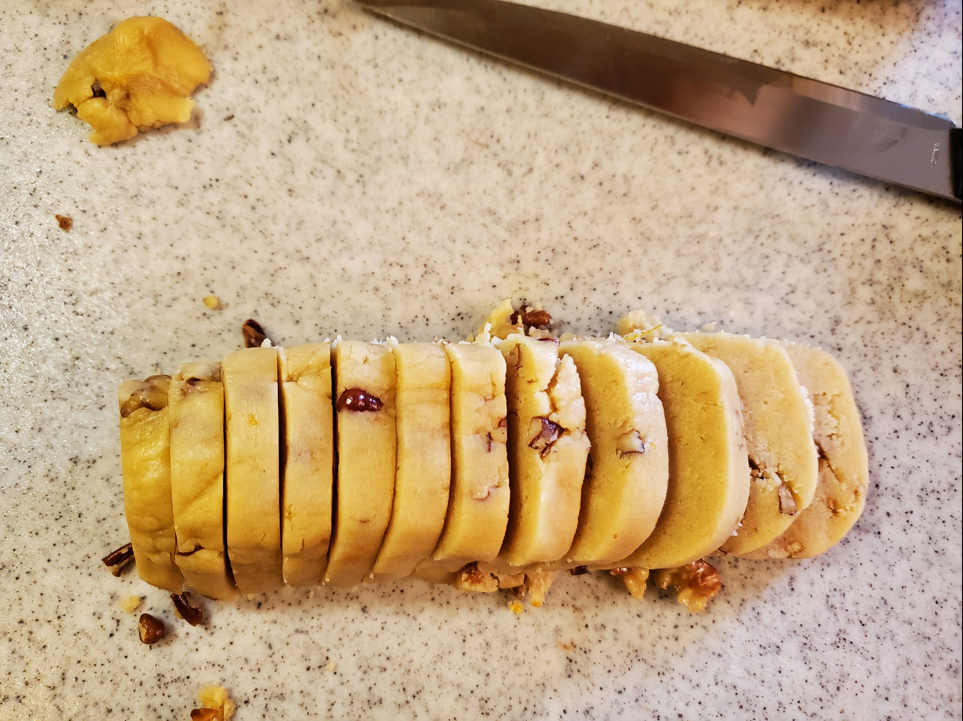 Once the dough is chilled, you can slice the dough. You will want to use a very sharp knife or a serrated knife, because you will need to cut through the nuts. When you cut the dough, the end slices will be slightly smaller than the rest. I usually take the end slices and the bits that fall off as I slice the remainder of the log, and at the end form it into another cookie, so none of it goes to waste.