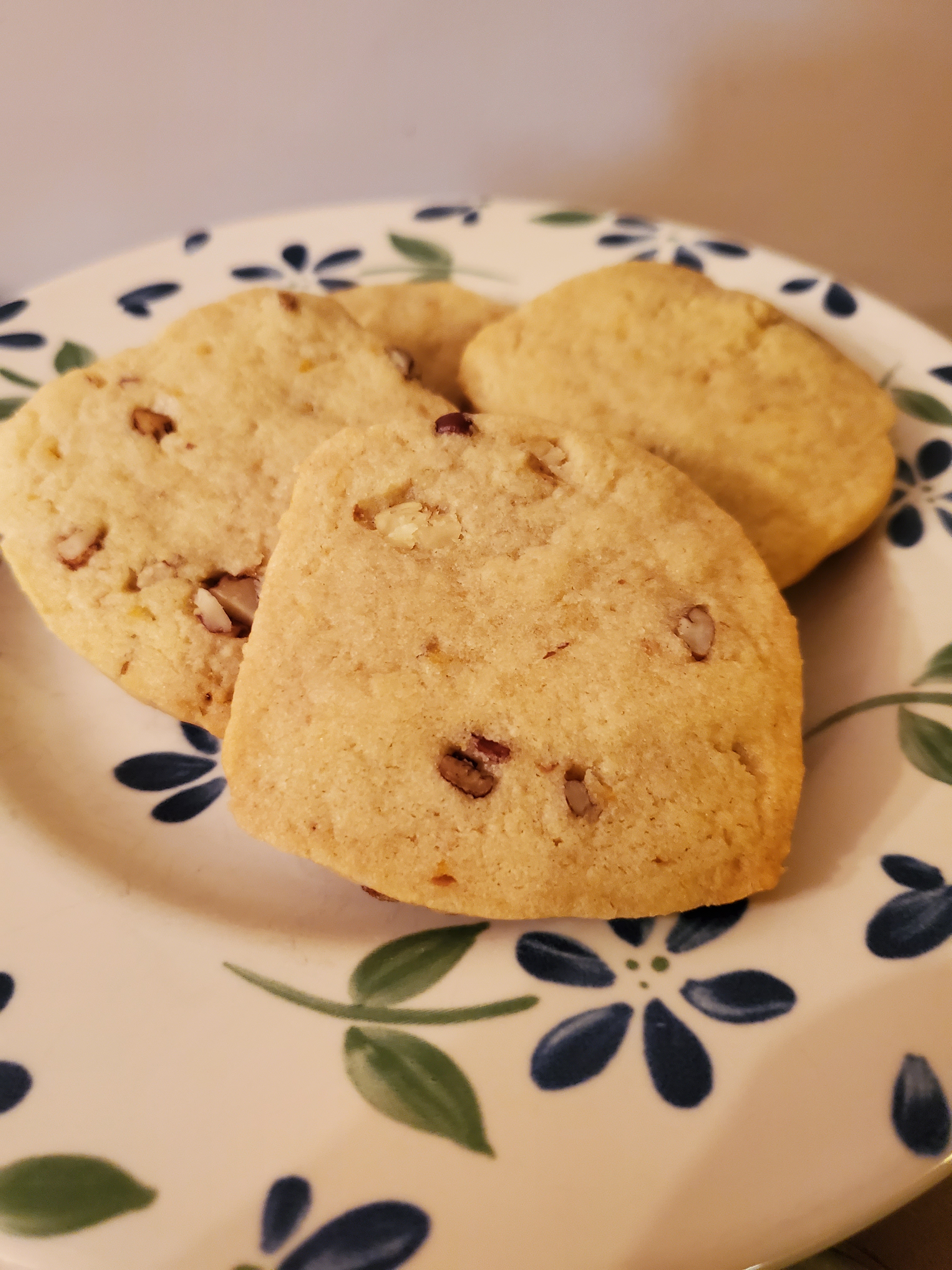 The basic icebox cookie is flour, salt, baking soda, shortening or butter, granulated and brown sugar, and egg. Most tend to then add some sort of fruit and nut to it. One of the most popular combinations with my family was candied cherry and pecan. Unfortunately, this not being the holiday season, it’s very difficult to find candied cherries in Los Angeles, so I chose to make this citrus version.