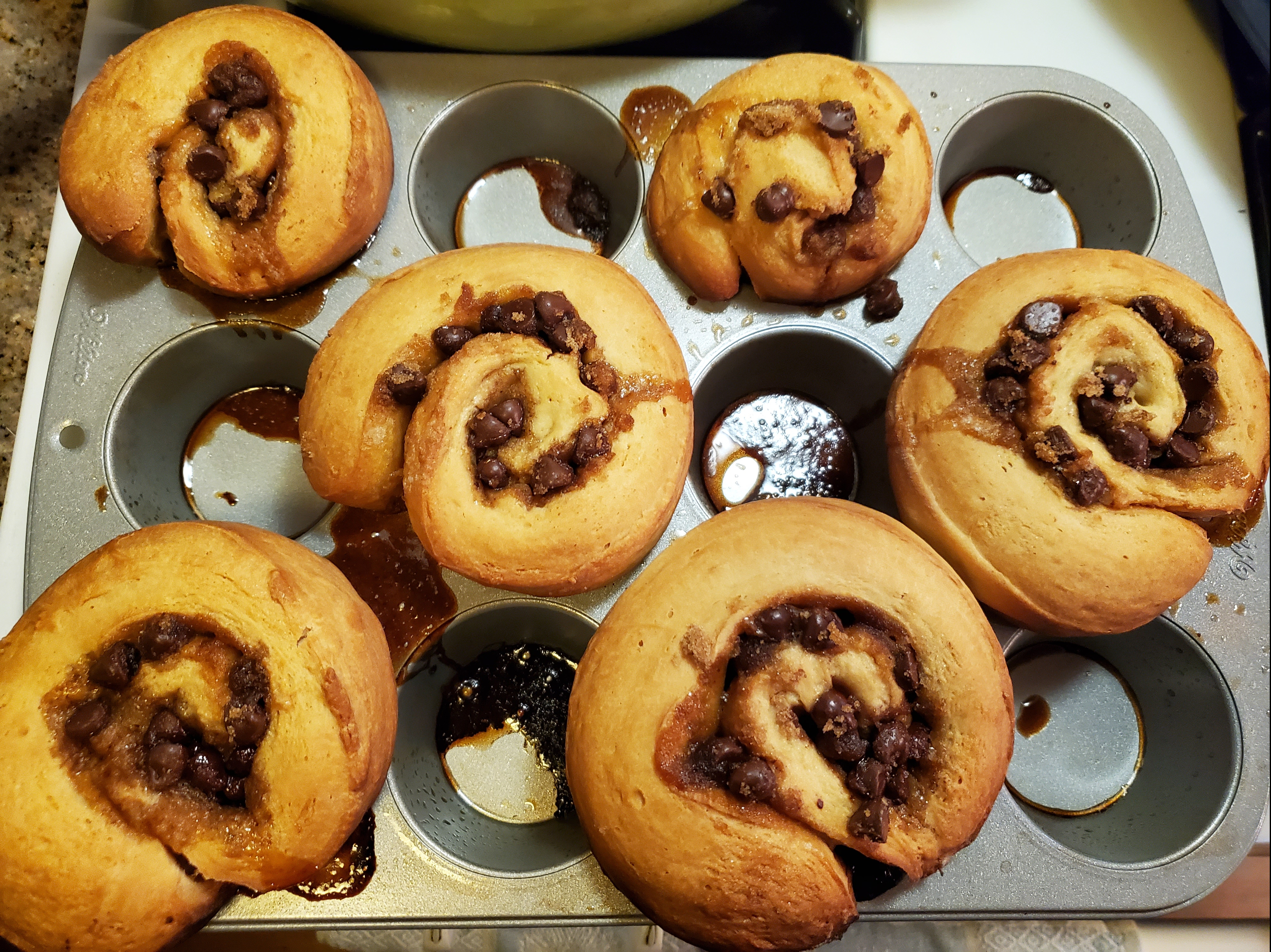 Bake the dough at 350 degrees. Unlike cake, the toothpick test won’t work on bread. I know they say that the bread should sound hollow if tapped, but I’m not sure if what I think sounds hollow is what anyone else would think is hollow. I did find one website indicated that the internal temperature should be 190 degrees, so I started testing it around 30 minutes. The brioche should be golden brown when done. As you can see on the picture above, as the dough rises and bakes, the brown sugar will melt and caramelize. Because of this, you want to make sure that you take the brioche out of the pan while they are still warm; otherwise, as they cool, they will stick to the pan. I used my offset spatula to gently nudge each brioche our of the tin. They came out fairly easily and none of the dough stuck to the pan. I also used the spatula to scoop out all that luscious crunchy caramel to snack on as the brioche cooled.