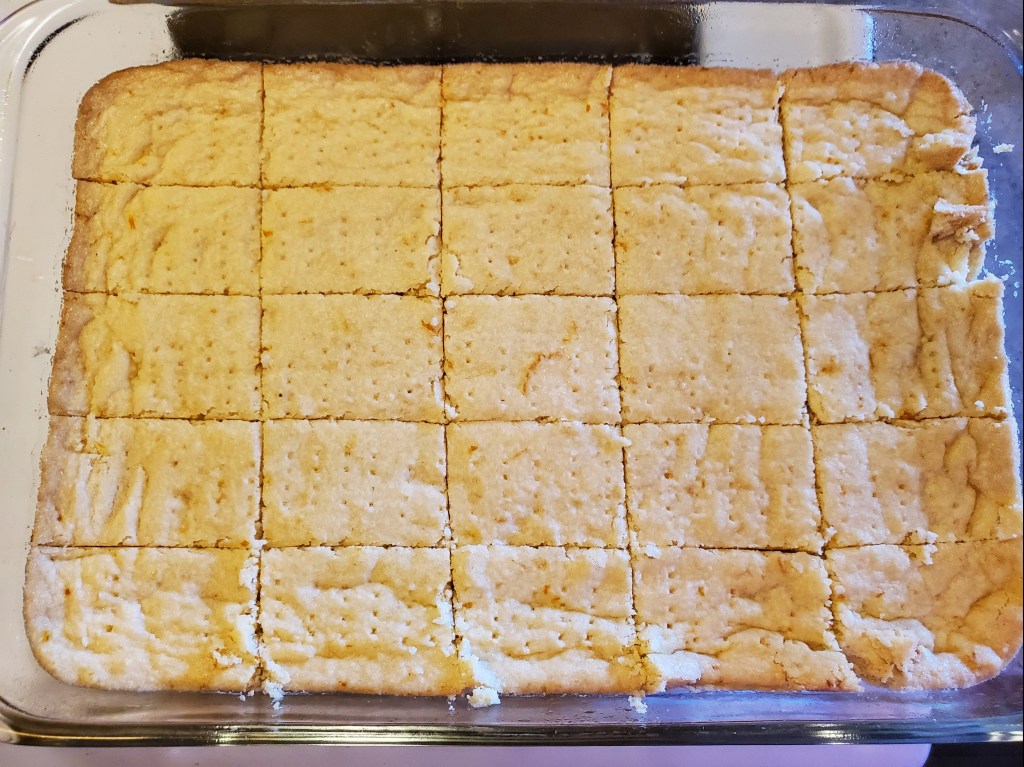 Since there is so much butter in a shortbread cookie, you want to refrigerate the dough until it firms. I refrigerated it overnight, but an hour will do. Remember to prick the dough with a fork before you refrigerate it, as this will allow steam to escape while baking, and once the dough is firm, it will be very difficult to do this. Mary’s original recipe indicated that the dough should be baked at 160 C/Fan 140 C/Gas. This converts to 320 F/Fan or 284 F/Gas. I do have a gas stove, but 284F seemed a bit low for baking a cookie, so I used 320 F and baked for 35 minutes.