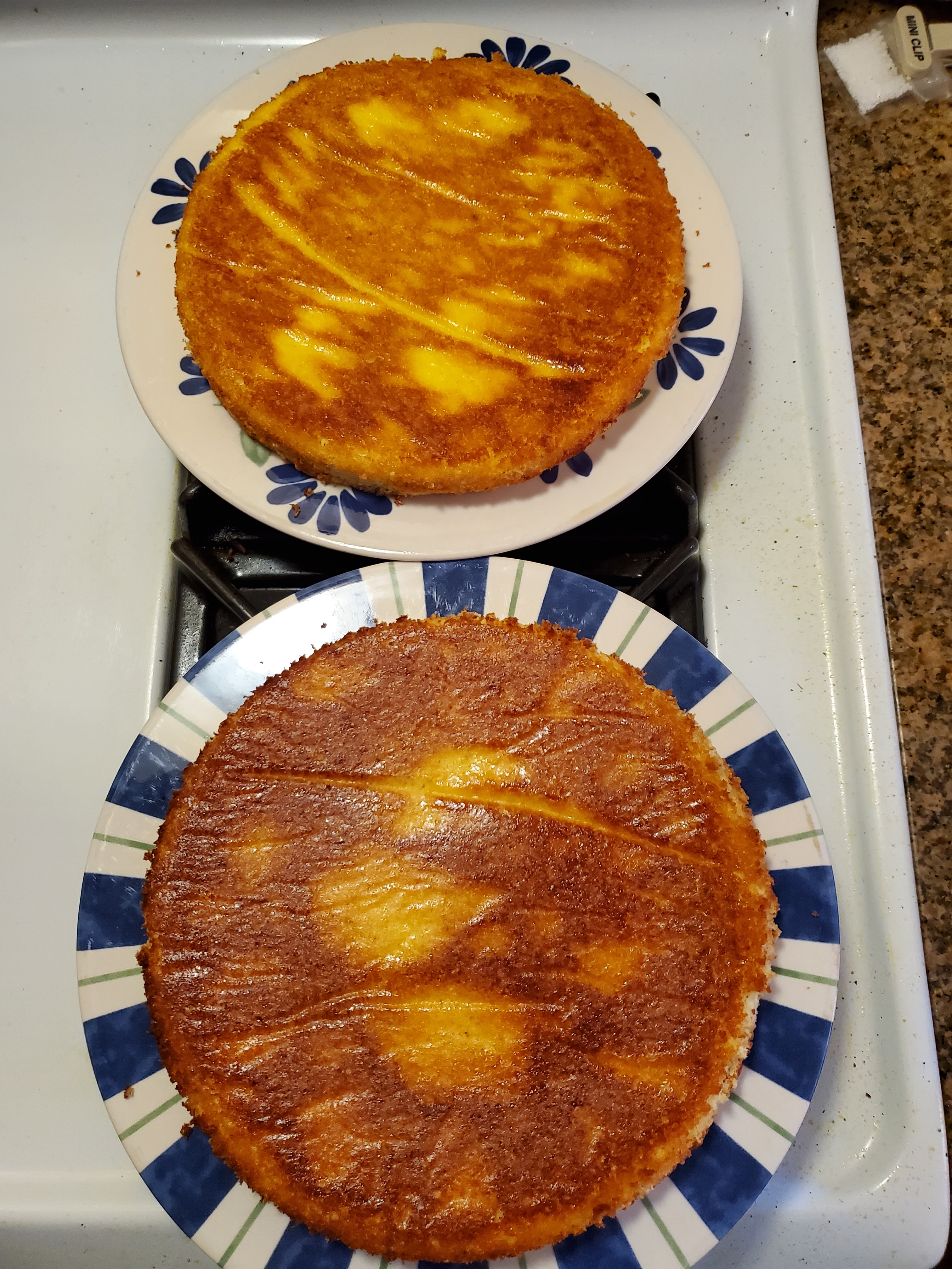 So I wondered, had I over folded or over whipped the egg whites? Or since the eggs were close to their expiration date did this cause them not to rise? I had just bought a new dozen eggs, so I decided to bake the cake all over again to see if I got a different result. Thirty minutes later, I found that I didn’t get a different result! I turned out both layers onto plates, and the little bits that stuck to the tin tasted light and fluffy, so I decided to go ahead and finish the cake with the two different layers I had baked.