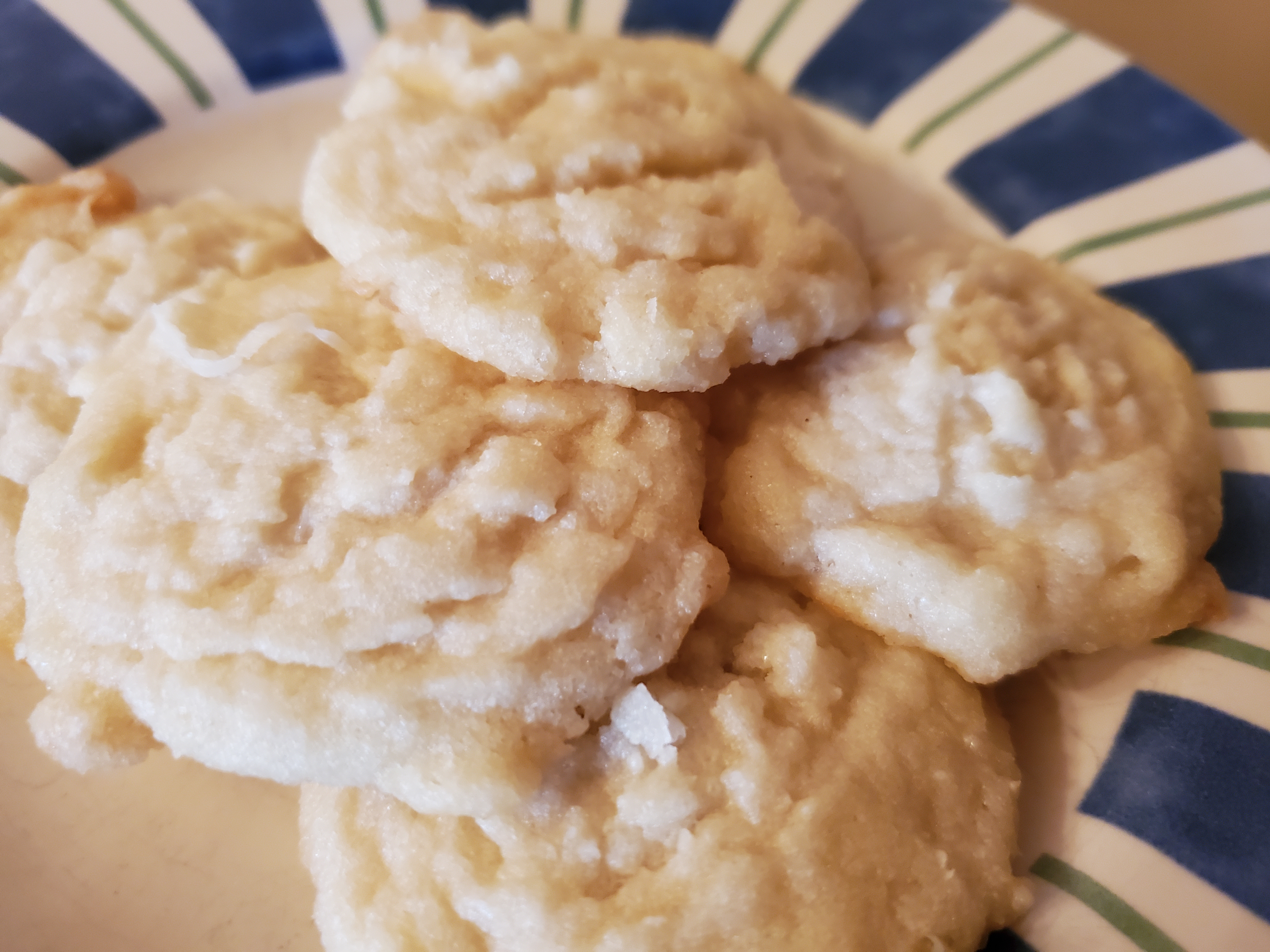 I am going in to the office for the first time in over a year, so I decided to bake for my coworkers. I’ve had this recipe in my big binder for quite some time, but I haven’t tried it, because I’m not a huge fan of coconut. I used to love it when I was a child, but as I got older, I just lost my taste for it. When I looked at the recipe, it kind of reminded me of a Snickerdoodle, so I knew it would be a fast and easy recipe to make in addition to my Hazelnut and Toffee Blondies. I decided to give coconut another try.