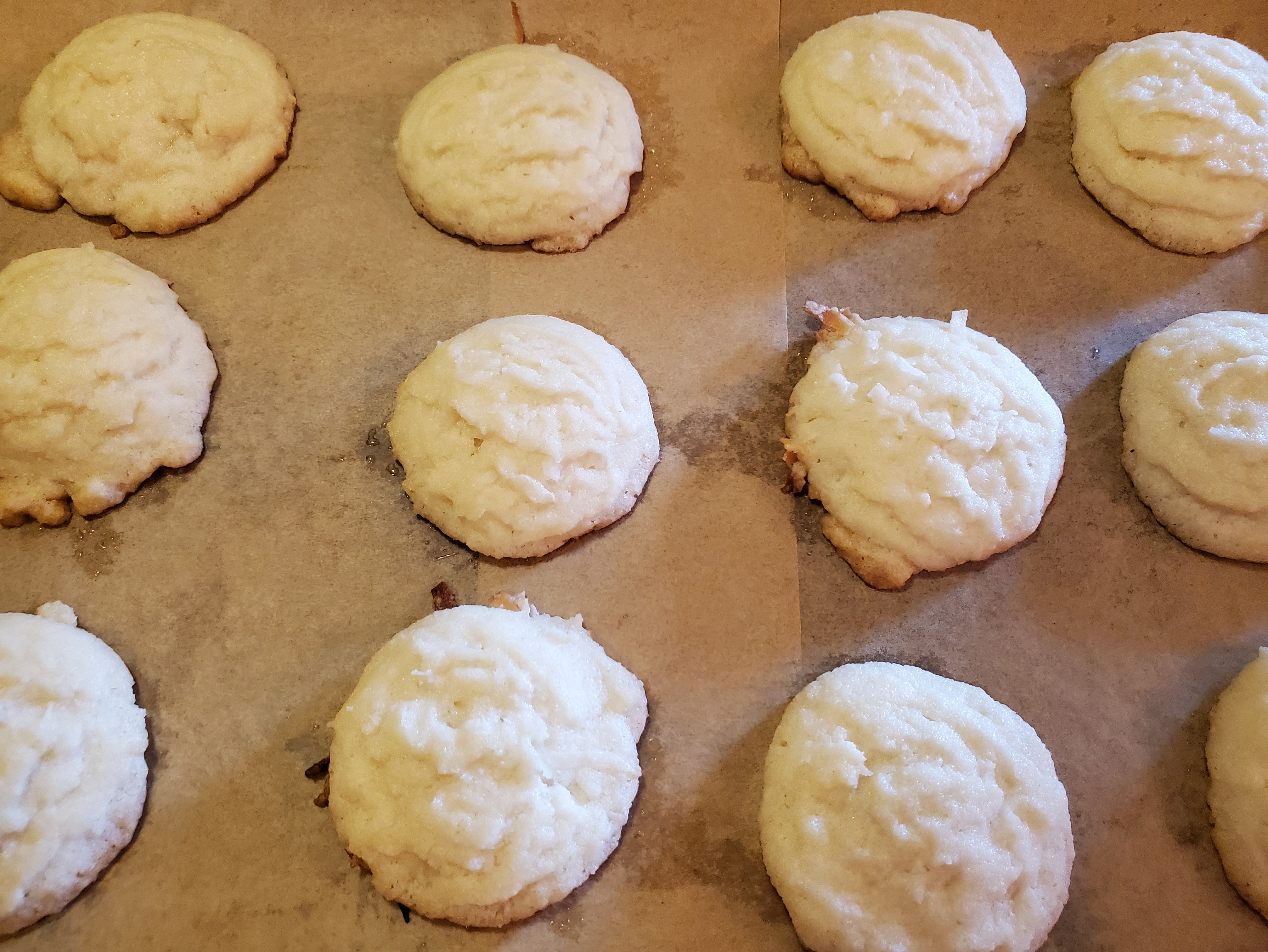 Line your cookie sheets with parchment paper or a silpat. You want to bake these light cookies until they are just beginning to brown. They puff up just like Snickerdoodles and as they cool, they will also sink in on themselves. Because they are so light and airy, you need to let them cool a few minutes before transferring them to a cooling rack so they firm up a bit; otherwise, they may actually fold down over the rungs.