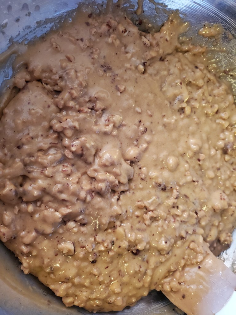 Usually I cream together the butter and sugar, but this recipe suggested melting the butter. You do end up with a much looser batter as a result. I also toasted my hazelnuts for about 10 minutes at 350 degrees, until i could smell the scent of the nuts and the nuts darken slightly. This releases the oils and gives you a much richer flavor. Keep the toffee chips in the refrigerator until the last minute, to keep them from melting away as they are baked. This also works for chocolate chips. Be sure to roughly chop the nuts before adding them to the batter.