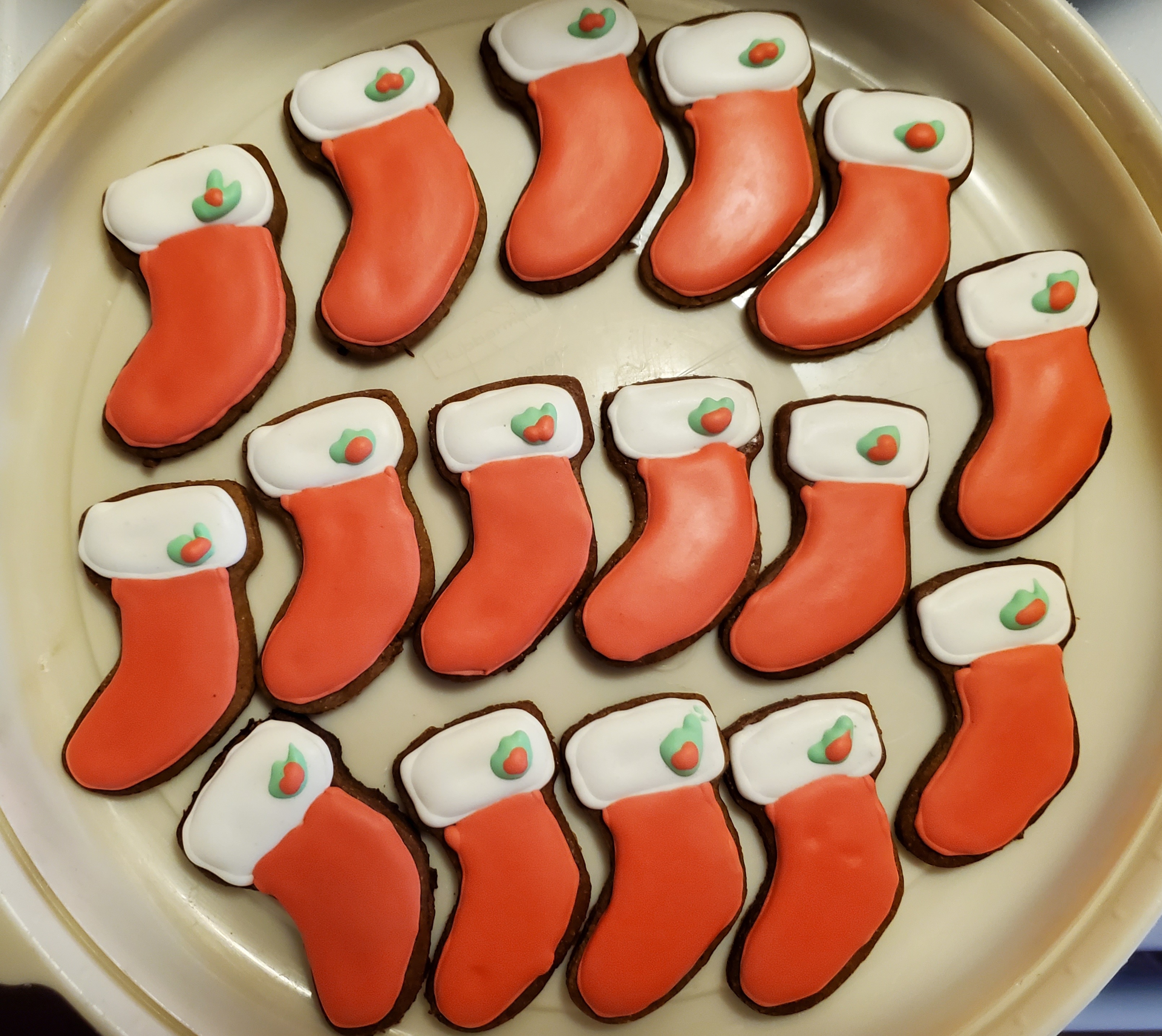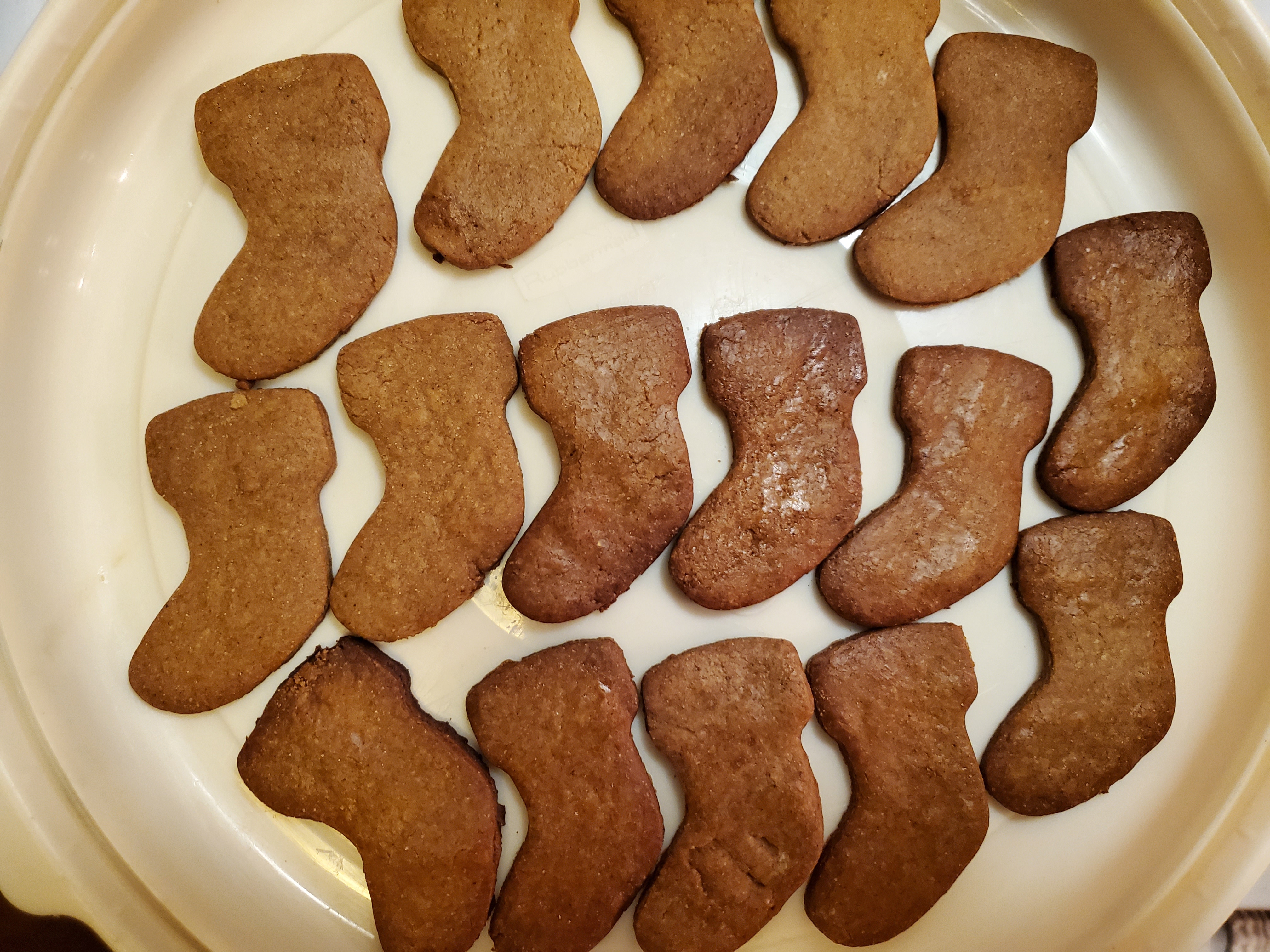 As with most recipes, I did make some alterations. One of the most notable changes is that I doubled the spices, in addition to adding nutmeg and clove. I used my stand mixer for this, because the dough can end up being a little stiff at the end. After you mix your dough, you will want to chill it for at least 24 hours before rolling it out. I like a crisper cookie, so I rolled them out to about a 1/4 inch thick. A helpful tool in rolling out dough is the set of rolling pin guide rings I got from Amazon. You just slide them over your rolling pin and you don’t have to use a ruler to try and see if your dough is the right thickness. I used three cookie cutters; Gingerbread Men (not pictured), Christmas Trees and Stockings. Depending on the size of your cookie cutter and the thickness you roll the dough out, will effect the number of cookies you get, so the yield listed below is approximate. You want to work in small batches and keep your unused dough in the refrigerator until you are ready to use it. Because the dough is refrigerated, the cookie will not spread as much as other cookies.