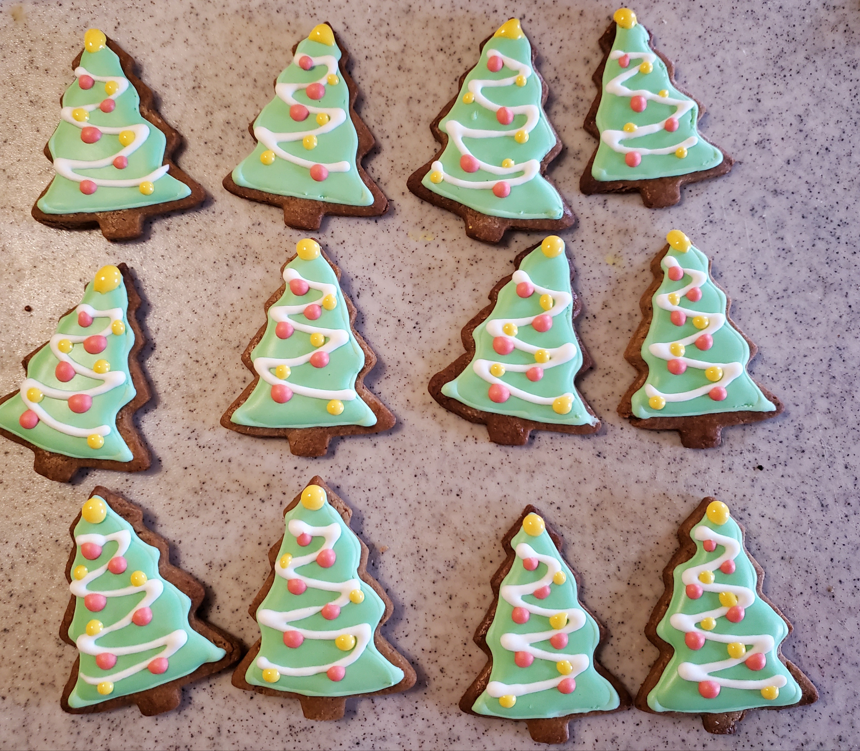 Cut the very tip of the bag off and outline the major areas with the medium consistency icing. After piping the outlines, make sure you fold over and secure the bags with a clip to ensure the icing doesn’t dry out. Flood each area with the thinned icing. You can use an icing pick or toothpick to help distribute the thinned icing. The goal is to not see the separation between the outline and the flooding. Fold over and clip the tips on the unused icing. To add additional decorations, you can use a wet-on-wet application, so the additional decorations are not raised above the flooding. I chose to let the base layer dry for 8 hours and then applied the holly and decorations to the trees, so that they were slightly raised. You can store any unused icing in a sealed container at room temperature for two weeks. While the decorations aren’t perfect, I believe for a first attempt I did pretty good. As they say, practice makes perfect!